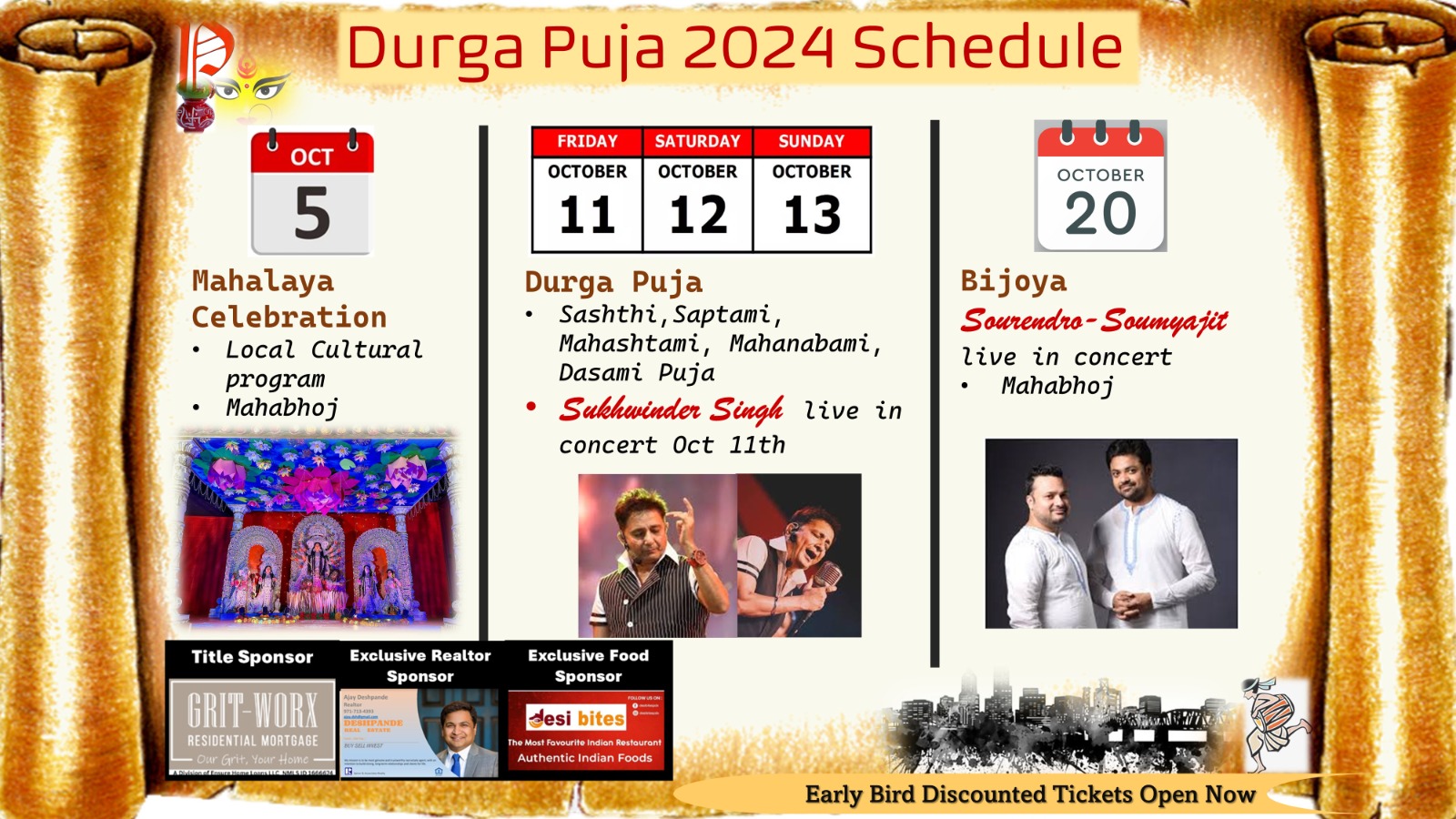 We are thrilled to announce the much-anticipated Durga Puja Celebrations, spanning over three exciting weekends! Join us for a grand celebration filled with joy, culture, and festivities as we come together to honor the divine goddess Durga.